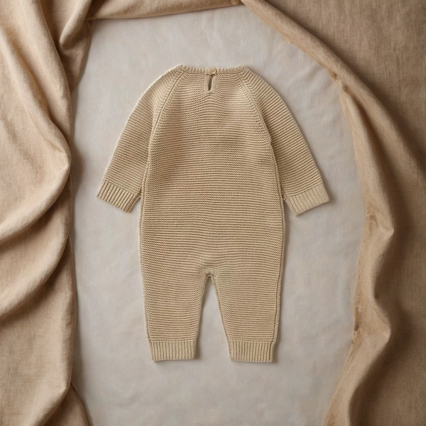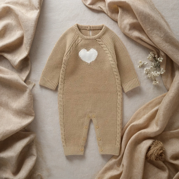 Romperiukas išsiskiria žavingu dizainu – megztu širdelės akcentu priekyje ir dekoratyvinėmis pynutėmis šonuose, kurios suteikia drabužėliui dar daugiau žavesio. Neutralios ir šiltos spalvos leidžia pasirinkti tarp kelių variantų, tinkamų tiek berniukams, tiek mergaitėms (šio modeliuko turime rusvą bei pelenų rožinę spalvas).