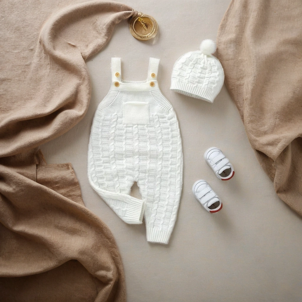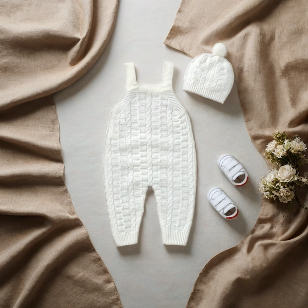 Švelnus, mielas ir jaukus – toks yra šis megztas romperiukas kūdikiui su derančia kepuraite su bumbulu. Pieno baltumo (švelniai kreminės) spalvos romperiukas spinduliuoja natūralumą ir švarą, todėl puikiai tiks tiek kasdienai, tiek šventinėms progoms ar fotosesijoms.