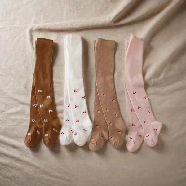 Stilingos, minkštos pėdkelnės mergaitėms ir kūdikiams – švelnių žemės tonų, su vyšnių, persikų ir gėlyčių raštais.
