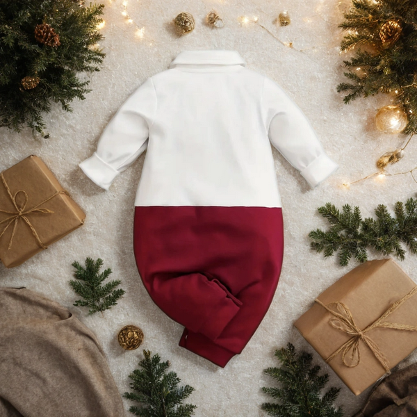 Šis išskirtinis bordo spalvos romperiukas — tobula apranga mažyliui šventėms, krikštynoms, fotosesijoms ar Kalėdoms. Atrodo kaip prabangus kostiumėlis, tačiau iš tiesų tai ypatingai patogus vientisas romperiukas, pasiūtas iš 100 % švelnios medvilnės. Baltos spalvos „marškinėlių“ viršus, deranti juoda varlytė (nusisega) ir elegantiška liemenė su sagutėmis suteikia mažyliui išskirtinio žavesio. Sagos per visą ilgį leidžia lengvai aprengti ir perrengti kūdikį.