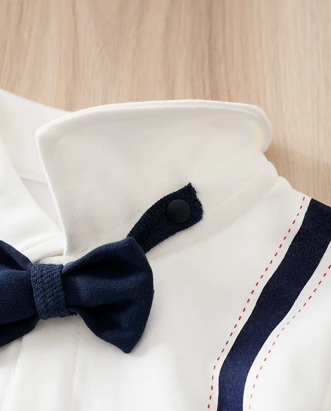 Modernus ir stilingas romperiukas kūdikiui, sukurtas taip, kad atrodytų kaip puošnus kostiumėlis su marškiniais, petnešomis ir varlyte (nusisega). Lygiai taip pat, kaip ir kiti modeliai, šis romperiukas yra vientisas, todėl jame mažyliui ne tik patogu, bet ir šilta. 100 % medvilnės sudėtis užtikrina švelnumą, pralaidumą orui ir komfortą. Sagutės per visą ilgį leidžia lengvai aprengti net naujagimį.