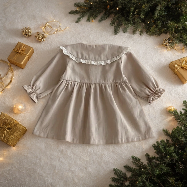 Ši šventinė kreminė suknelė iš 100% medvilnės – tobula apranga mažylei tiek ypatingoms progoms, tiek jaukioms akimirkoms namuose. Suknelė pasižymi išskirtiniu dizainu: dailiai krintantis siluetas, lengvai pūstos rankovės ir įspūdingas platėjantis apykaklės kraštas, dekoruotas švelniais nėriniais. Sagutės priekyje užtikrina paprastą aprengimą, o natūrali medvilnė garantuoja komfortą net ir jautriausiai odelei.